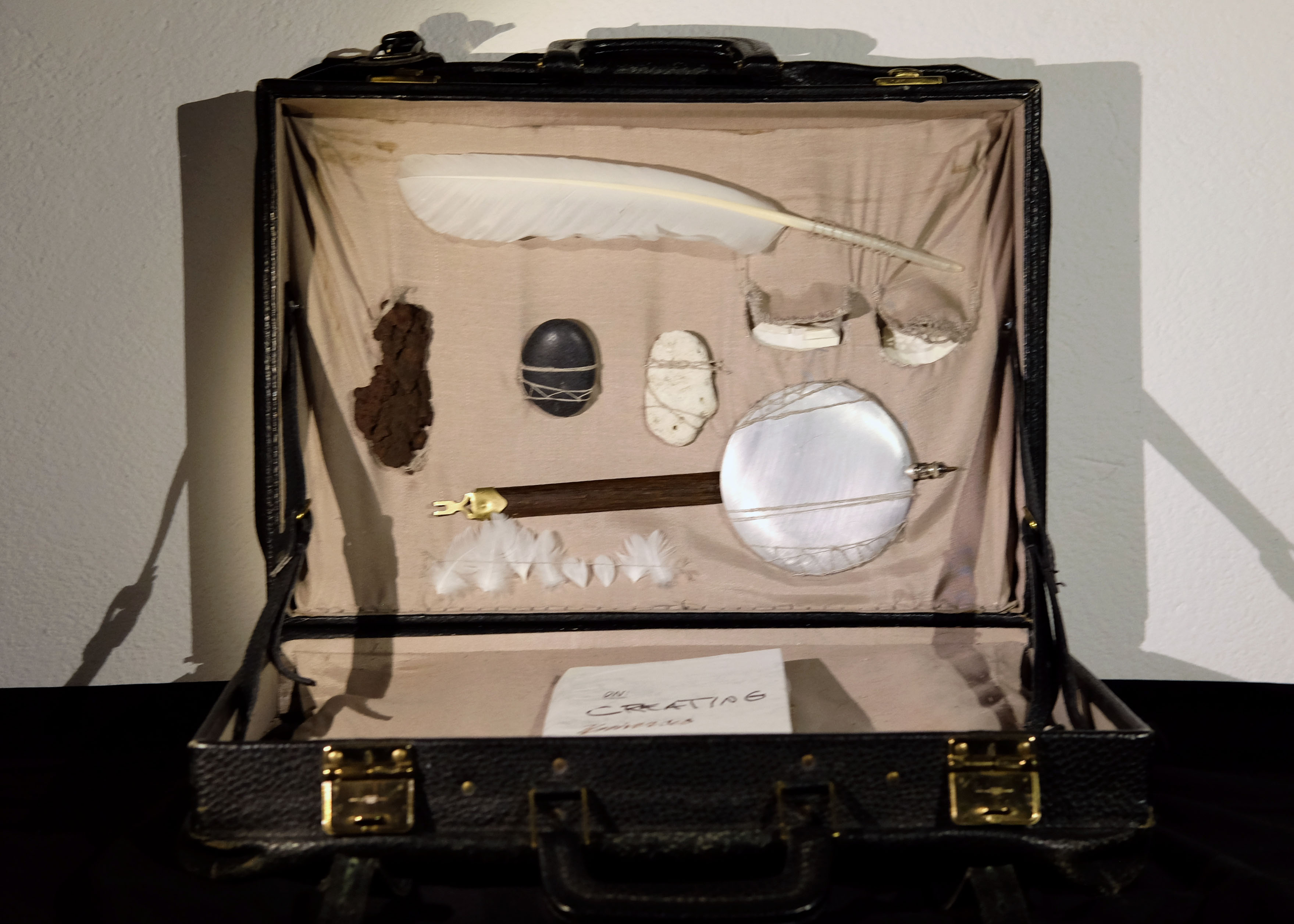 In Particular Mo(VE)ments the audience can meet the Traveling Companion because this is the moment they happen to be in these forms at the same moment in time and space. The Traveling companion wants to learn as much as possible about how our universe works, and being human, and is eager to meet with the audience and together marvel and find new ideas. In their suitcase is a collection of “interesting things” that respond differently to touch, gravity, light, etc, such as feathers, stones etc. And a paper bag; is it empty when full of air and light?